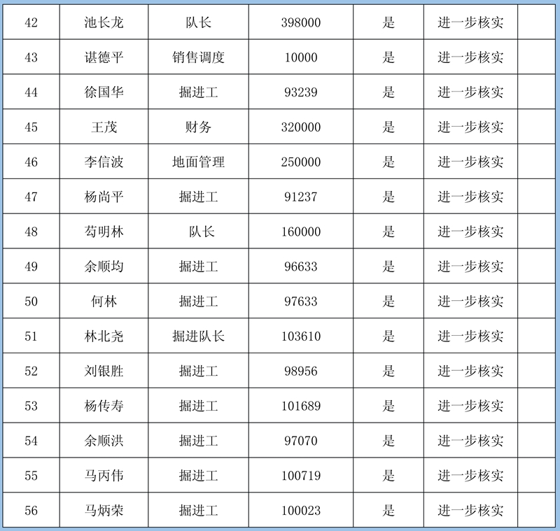 3、其他情況:煤礦方簽字認(rèn)可的216條欠薪申報(bào),均持有煤礦方開出的工資欠條(蓋章)或是法院判決書等相關(guān)依據(jù),實(shí)際用工情況無法核實(shí)。