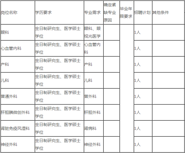 (一)市人民醫(yī)院。引進(jìn)崗位8個(gè),其中眼科1個(gè)、心血管內(nèi)科1個(gè)、產(chǎn)科1個(gè)、兒科1個(gè)、普通外科1個(gè)、肝膽胰微創(chuàng)外科1個(gè)、腎臟免疫風(fēng)濕科1個(gè)、神經(jīng)外科1個(gè)。
